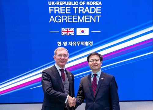 据外媒报道,韩国与英国已完成升级版自由贸易协定的谈判。该协定放宽了韩国输英汽车及消费品的原产地规则,同时为韩国企业拓宽了英国高铁与服务业领域的市场准入渠道。图片来源: 韩国产业通商资...