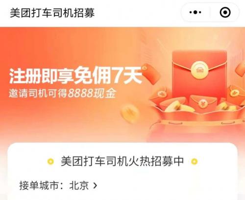 美团打车的司机招募政策是,注册即免佣7天,邀请司机可得8888元现金。王强所在的网约车司机群里,甚至流传着这样一个传说,“有司机通过美团的招募政策,一周赚了10000元”。