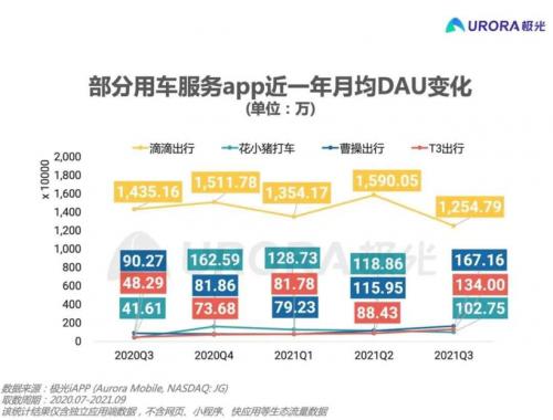 据极光数据显示,2021年第三季度,滴滴出行月均DAU(Daily Active User,日活跃用户数量)为1254.79万,远远领先于曹操出行和T3出行,后两者的DAU分别为167.16万和134万,不及滴滴出行的1/15。