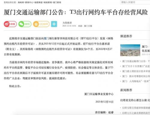 蒙眼狂奔的后果是过犹不及。12月16日,厦门市交通运输部门发布公告称,T3出行的经营许可证可能到期后无法延续,甚至存在被吊销的可能。有意与T3出行平台合作的广大企业、驾驶员应审慎评估风险,提高防范意识。