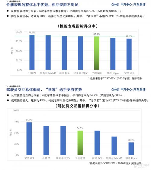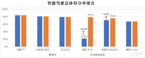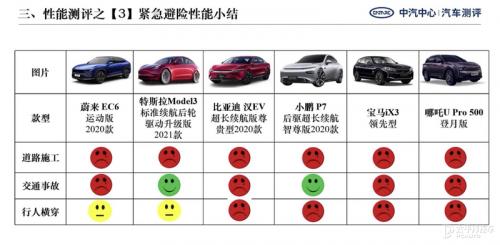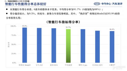从指标设置来看,它包含了人、车、环境多要素,并覆盖了消费者用车全过程。根据CCRT测评数据,特斯拉Model3、蔚来EC6、比亚迪汉EV、小鹏P7、宝马ix3以及哪吒U Pro的智能驾驶平均得分率为67.2%,整体表现一般。