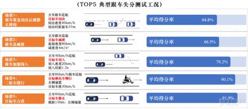 性能表现中,智能行车性能总体表现较好,平均得分率为91.7%,部分车辆对前车紧急切出避让、前车急减速、前车加塞闯入、二轮车缓行、目标车占道等中国典型驾驶行为的识别与响应存在不足。