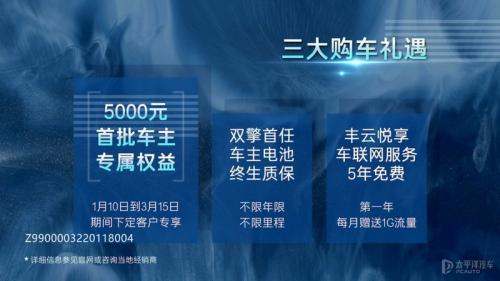 除此之外,首批车主还能获得多项福利,比如首任车主电池终身质保,以及车联网服务5年免费等等。