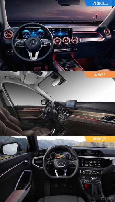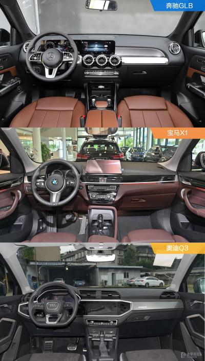 奔驰出品的内饰一直都都在大部分人的审美之上,奔驰GLB也是如此,其内饰对于科技感与豪华感的融合恰到好处,悬浮式双12.3英寸联屏洋溢着极高的科技感。银色饰板配合钢琴烤漆饰板提升了车厢的质感。相比之下,宝马X1的内饰虽然也拥有大尺寸屏幕助阵,但就观感而言,质感与奔驰GLB仍有差距。而奥迪Q3,其内饰对科技感的营造十分到位,配合翻毛皮以及银色饰板,质感并不差,但少了一丝豪华的气质。