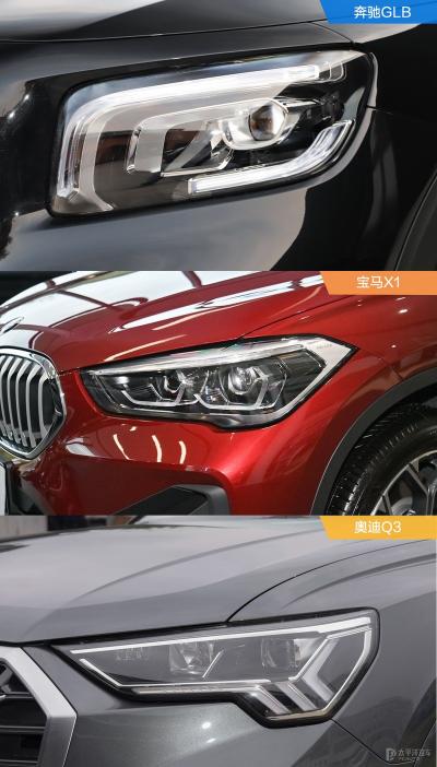 方形的元素在奔驰GLB上随处可见,其方形的前大灯组配备了LED灯源,同时还提供了奔驰远近闻名的几何多光束LED大灯供选配。虽然宝马X1与奥迪Q3均提供了LED大灯,但并未提供更高阶的矩阵LED或激光大灯进行选配。