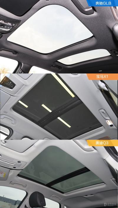 值得一提的是,奔驰GLB全系标配双天窗,而宝马X1、奥迪Q3为全景天窗。不管哪个车型配置,都能很好地照顾后排的乘客,带来了极佳的前后排采光效果,提升车内的视觉感受,大大降低车内的压抑感。