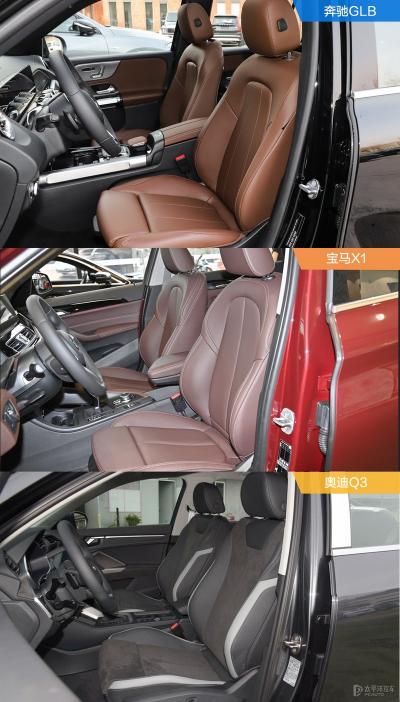 在座椅舒适度上,奔驰GLB提供了豪华型座椅,该座椅在舒适性方面基本挑不出毛病,侧翼也拥有良好的支撑性。在座椅配备上提供电动调节,并提供8向电动调节以及座椅加热选配。宝马X1的主驾座椅在电动调节的基础上提供了座椅记忆,而奥迪Q3的座椅则加入了翻毛皮的包裹,让整张座椅在观感上更为运动。