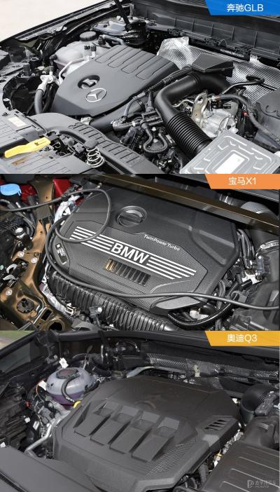 奔驰GLB全系搭载1.3T发动机,根据车型配置的不同提供高低功率发动机,其中前驱车型均匹配7速双离合变速箱,而四驱车型则匹配8速双离合器变速箱。宝马X1根据车型不同提供了一款1.5T三缸发动机以及一款2.0T四缸发动机,其中sDrive车型均匹配7速双离合变速箱,xDrive车型匹配8速手自一体变速箱。奥迪Q3根据车型不同提供一款1.4T发动机以及一款2.0T发动机,两款发动机均匹配7速双离合变速箱。