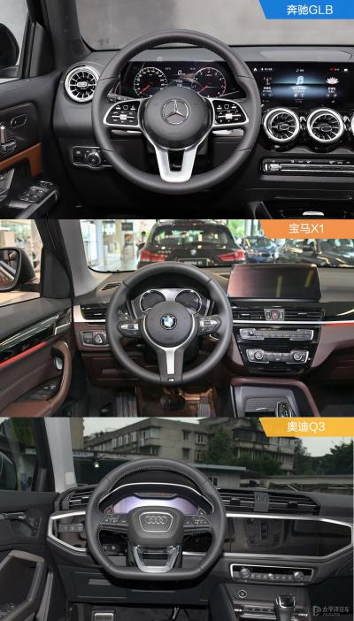 奔驰GLB握感饱满的真皮方向盘3/9点布置着丰富的多功能按键,为驾驶员同时操作两块屏幕提供了便利。但值得一提的是,其中的多向选择键采用了触控的形式。而宝马X1与奥迪Q3的多功能按键则依旧采用拨杆/滚轮+按键的形式,但在功能性上不如奔驰GLB来得丰富。