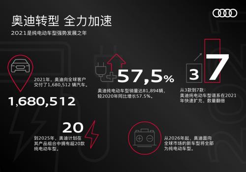 同时,奥迪的纯电动车型阵容在2021年从3款上升至7款。2021年,奥迪纯电动车型销量达81,894辆,同比增长57.5%。到2025年,奥迪计划共推出超过20款纯电动车型。从2026年起,奥迪面向全球市场的新车型将全部为纯电动车型。