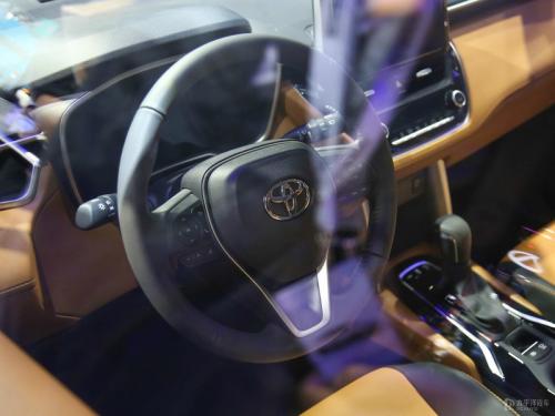 内饰部分,参考美版Corolla Cross车型,基本沿用了卡罗拉车型的内饰设计与布局,仪表台以及中控下部设计稍有调整,仪表台与鞍座之间加入了尺寸较大的储物空间,让整体个内饰的观感更符合跨界车的风格。