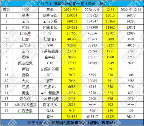 其中,“德系三强”(含新能源车型)的销量之和达469781辆,占据了64.81%的市场份额,相比去年同期的75.96%下降了11.15个百分点。统治C级车市场近30年的奥迪A6L,去年前7个月一直保持着强势的表现;但受芯片短缺的影响,后半程的市场表现明显乏力。好在凭借最后一个月的正常发挥,奥迪A6L守住了C级车市场的冠军,但仅比第二名领先901辆。数据显示,12月,奥迪A6L的销量为12015辆;全年累计销量为150054辆。