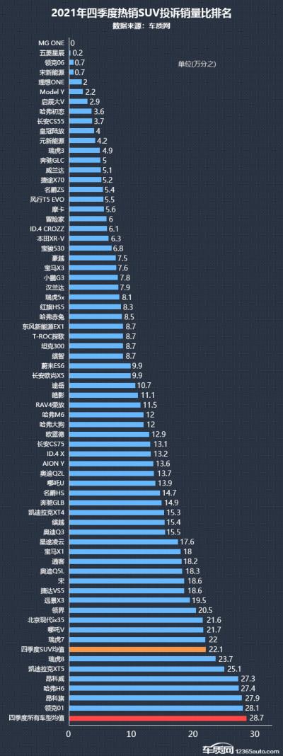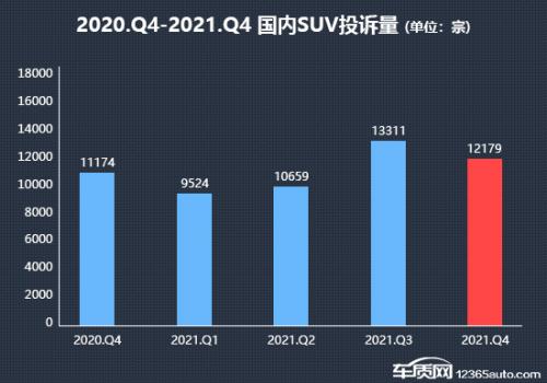 据国内领先的缺陷汽车产品信息收集平台车质网数据显示,2021年四季度国内SUV累计投诉量为12,179宗,乘联会数据显示同期国内SUV(除进口车)销量约为305.6万辆,其中12月份销量最高,约为111.4万辆。经统计,2021年四季度有销量数据支撑的SUV投诉销量比均值为万分之22.1,数值较三季度的万分之31.7明显下降,整体投诉销量比表现有所好转。
