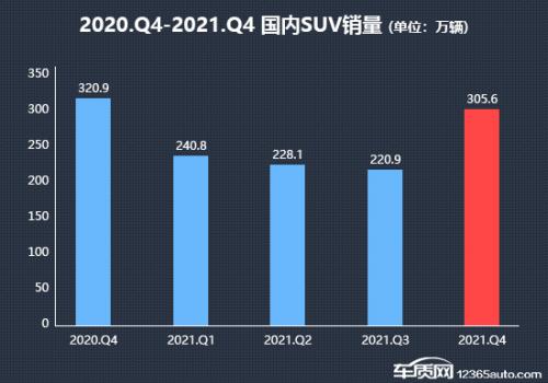 从近一年来各季度销量变化来看,四季度SUV(除进口车)销量终止了“三连跌”,实现触底反弹,再次回归300万辆,环比上涨38.3%,与去年同期相比下降4.8%。