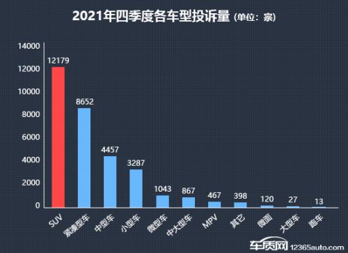 四季度国内SUV市场有所回暖,累计销量超过了同期轿车销量。四季度,SUV的投诉量连续第三个季度突破万宗,体量远超其他各类车型,但投诉量较三季度略有下降。