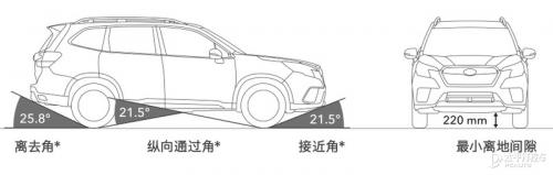2022款森林人升级了车身的越野参数,车头接近角有21.5度,车尾离去角达25.8度,而纵向通过角也有21.5度,最小离地间隙提升至220mm。(注:不同配置的车型的越野参数会有所不同,但整体差别不大。)
