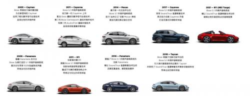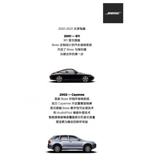 2001年,保时捷在911车型上首次搭载Bose定制设计的汽车音响系统,开启了Bose与保时捷长期合作的第一步;随后在2002年,对于保时捷极具里程碑意义的车型Cayenne问世,即成为首款搭载Bose环绕声音响系统的保时捷,Bose数字信号处理技术和AudioPilot噪音补偿技术的首次搭载,可智能提高被噪音覆盖部分的音乐音量,营造更为稳定的聆听体验。