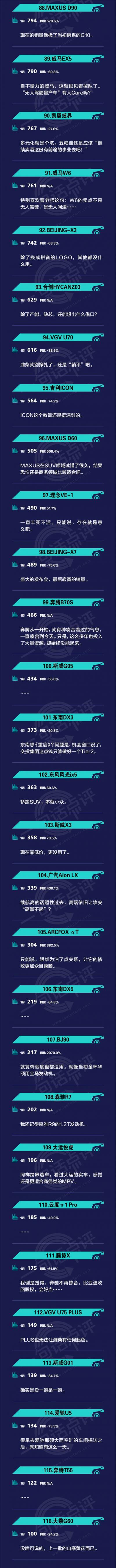目前来看,随着“一超多强”格局的确立,自主SUV除了去年换代的哈弗H6“一超”,长安CS75PLUS、CS55PLUS两款SUV本月都超过3万辆,比亚迪宋凭借DM-i的成本大法杀到TOP4,还有吉利系、奇瑞系虎视眈眈,而斯威、爱驰、东南、奔腾等等弱者加速凋零,都让SUV市场向着更“卷”的方向演化。更遑论,乘联会的名单上长长的一串业已阵亡的SUV们,这其中包括太多熟悉的品牌名字,比如WEY的VV系列。