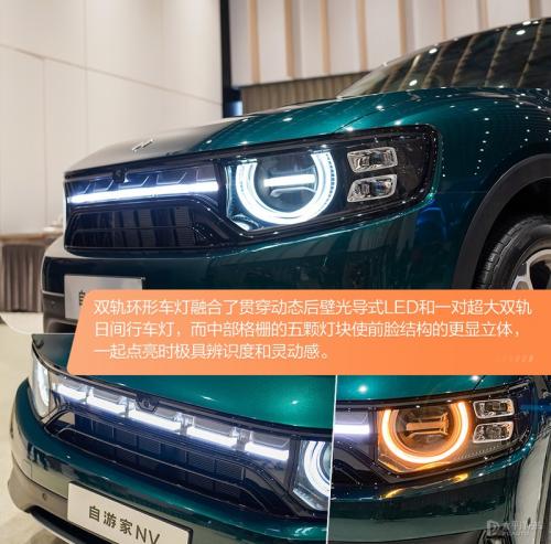 自游家NV设计采用相对方正的车身线条作为主调,以符合Urban Exploring的设计理念,前脸使用了LED光源组成的双轨环形车灯,加上贯穿动态厚壁式光导LED,令前脸看上去还跟话题十足的福特Bronco有几分相似。另外,即使车身尺寸达到长4915/宽1962mm/高1745mm,轴距2910mm,由于悬浮式车顶、巨大的前大灯区域等元素削弱了视觉上的巨大体量,在照片上车辆并不显大,反而渗透出几分精巧的气息。