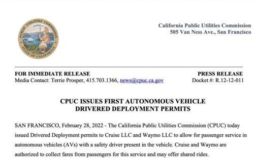 2月28日,加州公共事业委员会(CPUC)给Cruise和Waymo颁发配备安全员并付费自动驾驶服务牌照:Cruise可在旧金山部分公开道路晚10点到早6点提供付费自动驾驶服务,速度不超过30 mph;Waymo可在旧金山和San Mateo郡指定区域任何时候提供付费自动驾驶服务,速度不超过65 mph。这是Cruise也是自动驾驶又一个里程碑。