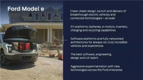 Ford Model e是福特面向未来的创新和业务增长核心,负责开发和完善跨业务单元应用的技术和概念,设计开发纯电动、智能网联汽车产品和服务;电动汽车平台、三电系统、充电以及电池回收业务均被囊括其中,并肩负开创软件平台和智能网联汽车架构(FNV)的重任。