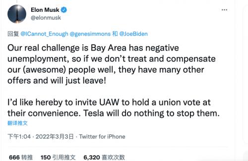马斯克在3月3日发布推文称:“我在此邀请UAW在他们方便的时候来举行一次工会投票。特斯拉不会做任何阻止他们的事情。”UAW没有立即对马斯克的邀请发表评论,但是分析人士表示,马斯克在过去一年中的实际做法与本次表态并不相符。