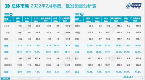 根据乘联会公布的最新数据,2022年2月,我国乘用车市场零售量达到124.6万辆,同比增长4.2%,环比下降40.0%。今年1-2月,市场累计零售量达到332.4万辆,较2021年同期减少了6万辆。