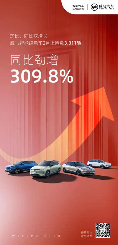 日前,威马公布了最新交付数据。今年2月交付智能纯电车3,311辆(上险数),同比增长309.8%。值得关注的是,2月的新能源汽车市场受到春节假期、2月份天数较少等因素影响,环比下降22.6%,但环比降幅要小于历年2月的走势。受此影响,部分车企环比降幅甚至超过50%。威马能够在春节淡季的情况下,实现环比、同比双增长,增量潜力不容小觑。