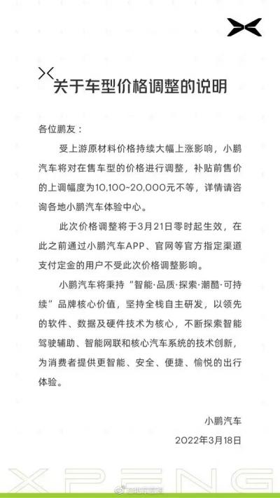 3月18日晚,小鹏汽车发布关于车型价格调整的说明。其中指出,受上游原材料价格持续大幅上涨影响,小鹏汽车将对在售车型的价格进行调整,补贴前售价的上调幅度为10100~20000元不等。