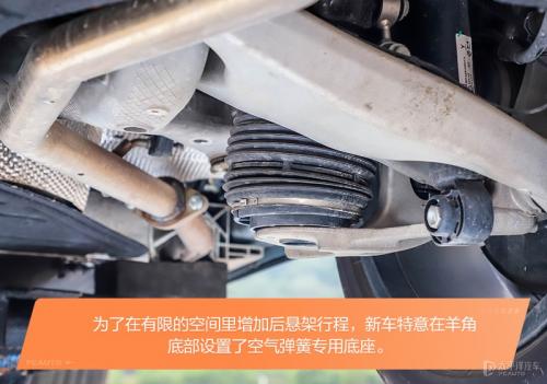 此外,一般车型上减震弹簧会布置在H臂上,而岚图FREE在特意在羊角底部设计了一个底座用于安装空气弹簧,相比传统布局,这样的设计可以让增加空气弹簧的行程,更有利于舒适性的表现。