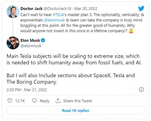3月21日,马斯克在推特上回应,特斯拉宏图第三篇章的重点是将特斯拉的规模扩大到“极致”以及AI。马斯克认为特斯拉扩大规模是人类摆脱化石燃料所需要的。