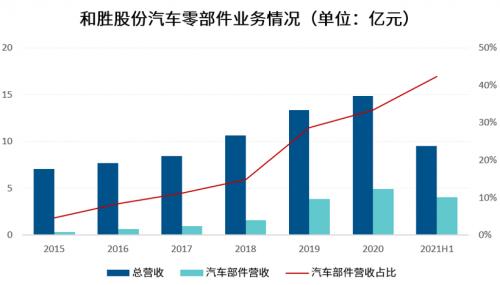 据官方财报,2019年-2021年上半年,和胜股份汽车零部件业务分别实现营收3.82亿元、4.94亿元、4.01亿元,占比分别为28.64%、33.27%、42.3%。其中2020年,电池托盘及配件业务营收占比达到了18%。2021年上半年,和胜股份的汽车零部件业务营收占比甚至超过了其主要的电子消费品业务。