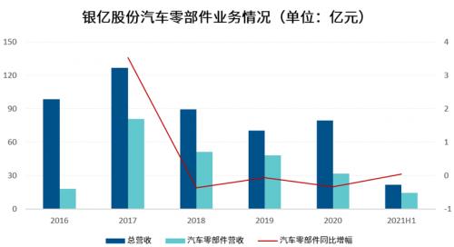在零部件业务并表后,银亿股份的业绩也有过短暂的增长。但从2018年开始,银亿股份连续三个会计年度的扣非净利润均为负值,亏损额度分别为15.16亿元、71.75亿元和12.98亿元。这背后,银亿股份汽车零部件业务板块表现低迷是很重要的一部分。2018、2019、2020年,银亿股份汽车零部件板块分别实现营收51.23亿元、47.86亿元和31.54亿元,同比分别下滑36.54%、6.59%和34.09%,汽车零部件营收占总营收比例分别57.12%、67.90%和39.63%。
