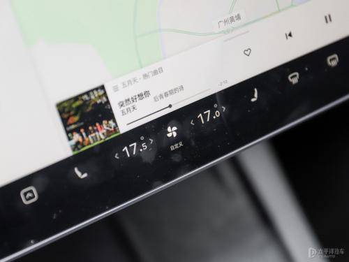 在中控屏中,屏幕左侧固定显示的是车辆的基本状态,包括当前所在档位、时速计、转向灯开启情况、车辆各个门的闭合以及中控锁的控制。空调温度调节、前排座椅加热、风挡除雾、音量调节等各项常用功能的图标,被规整地安放在屏幕下方供驾驶员快速操作。