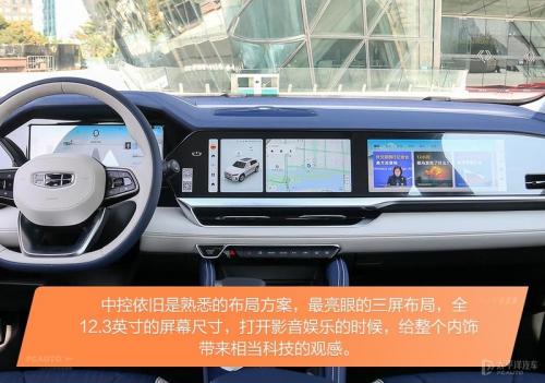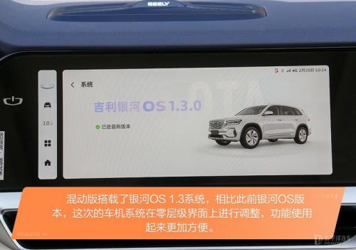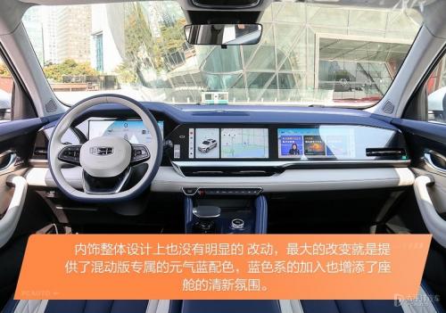 内饰方面,依旧是延续着燃油版的风格,本次混动版也提供了专属的元气蓝配色,在内饰材质上也选用了环保麂皮作为主材质,整体也体现了环保的理念。当然这次重点还是银河OS车机系统的升级,来到了1.3版本,也加入了更多贴近我们使用逻辑的操作。