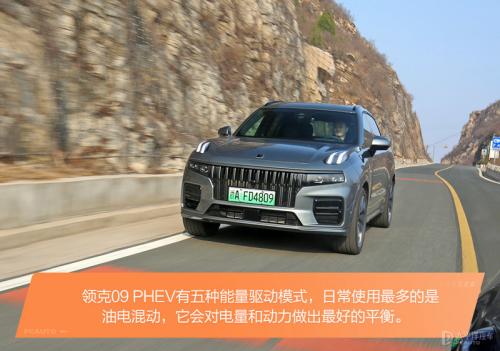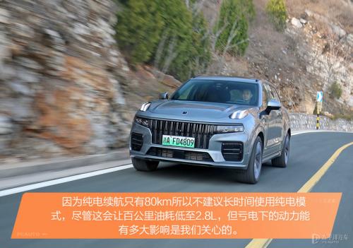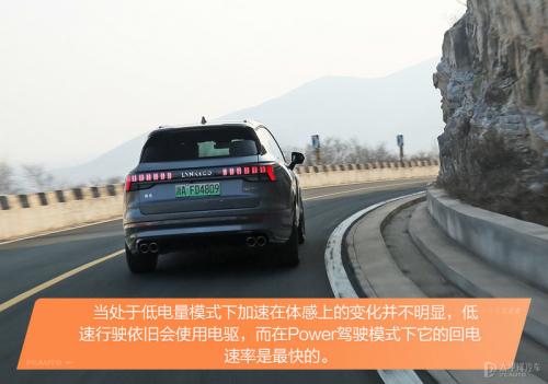 Power强动力模式就很好理解了,在该模式下一切都已动力为优先级,电机与发动机实现最大化的动力输出,动力响应会从积极变成激进需要适应一下,因为整车的状态都表现得有点亢奋,当然,在这个模式下掉电也非常的显著,但从动力作用到车身的反应来看更像是一台加速进入5秒的性能车该有的样子了。80km的NEDC综合续航在Power模式下消耗的很快,当处于低电量模式下加速在体感上的变化并不明显,那么领克09的插电混动在亏电模式下的加速影响能有多少,后面的测试环节我们再进一步了解。