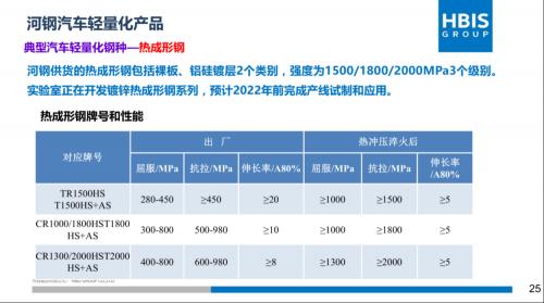 热成形钢,轻量化品种里面最重要的一个战略品种,目前河钢能够供货的热成形钢包括裸板、铝硅电层板两个类别,包括1500Mpa、1800Mpa、2000Mpa,三个级别。其正在开发镀锌热成形钢系列,可能在今年会进行进一步的应用。