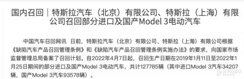 自2022年4月7日起,召回生产日期在2019年1月11日至2022年1月25日期间的部分进口及国产Model 3电动汽车,共计127785辆(其中进口Model 3汽车34207辆,国产Model 3汽车93578辆)。