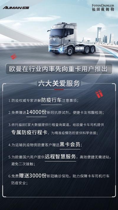 作为肩负社会责任感的重卡品牌,欧曼始终坚持为卡友们提供全方位的车辆与服务保障,把保护卡友们的利益放在首位。欧曼营销公司总经理杨志江表示:“针对当前防疫政策及物流运输现状,为切实解决卡车司机顾虑,助力物流畅通,欧曼在行业内率先向重卡用户推出六大关爱服务。在当前疫情态势下,欧曼致力于推动物流畅通,提高物流运转效率,在为民众提供生活保障的同时,呼吁全社会共同参与,帮助卡车司机解决当前疫情期间的物流运输困境,让公路物流早日恢复高效运营。”