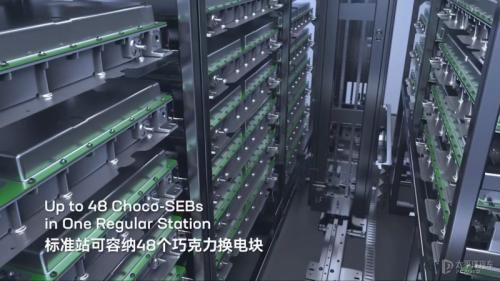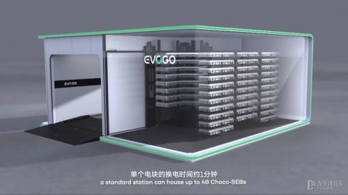 在换电站方面,EVOGO乐行换电标准换电站占地约3个标准停车位,对应不同气候条件的地区都有针对性设计,可以灵活的布局在各个地区。每个标准换电站可容纳48块巧克力电池块,单个电池块换电时间仅需约1分钟,可以做到高效快速的流通。
