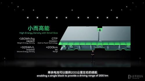 据宁德时代官方介绍,电池块能量密度为160Wh/kg,体积能量密度在325Wh/L,每一块电池块对应的续航在200km左右。根据不同需求,电池块可以自由组合,三块电池块就可以实现约600km的续航。