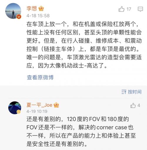 这一次,理想汽车创始人李想又在微博上,和集度汽车CEO夏一平关于激光雷达的安装位置,在线“掰头”。