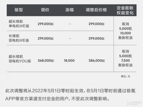 4月22日,我们从极氪品牌官方获悉,受上游原材料价格持续上涨等因素,决定对极氪001车型价格及购车权益进行调整。