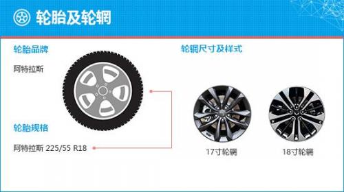 五菱凯捷提供了一种尺寸,两种风格样式的轮圈。其中低配三款车型均配备的是双五辐枪灰色18英寸轮圈,造型较为运动;顶配车型配备的是18英寸双色铝合金轮圈,结构更加复杂,造型也比较精致时尚。轮胎方面,全系车型均配备的是阿特拉斯(ATLAS) BATMAN A50系列轮胎,胎面花纹采用非对称设计,除了拥有舒适的驾乘感受和出色的高速稳定性,还能提供足够的湿地抓地力,这款轮胎的市场价在520元左右。