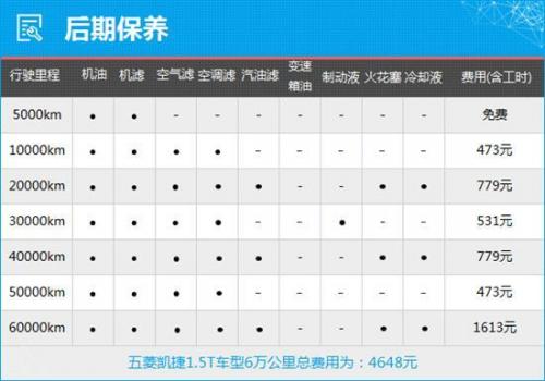 在保养周期和项目上,五菱凯捷首次保养里程为5000公里,此后保养间隔周期为每10000公里或6个月,必换的项目为更换发动机机油和机油滤清器。此外,空气滤清器和空调滤清器的更换周期为每1万公里或6个月;燃油滤清器、火花塞和防冻液为每2万公里更换一次;刹车油为每3万公里更换一次;变速箱油每6万公里更换一次。6万公里总费用为4648元,如果以每年行驶2万公里来算的话,五菱凯捷车型平均一年的保养费用大概需要1549元。