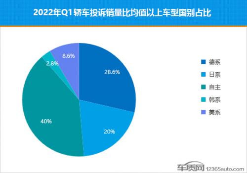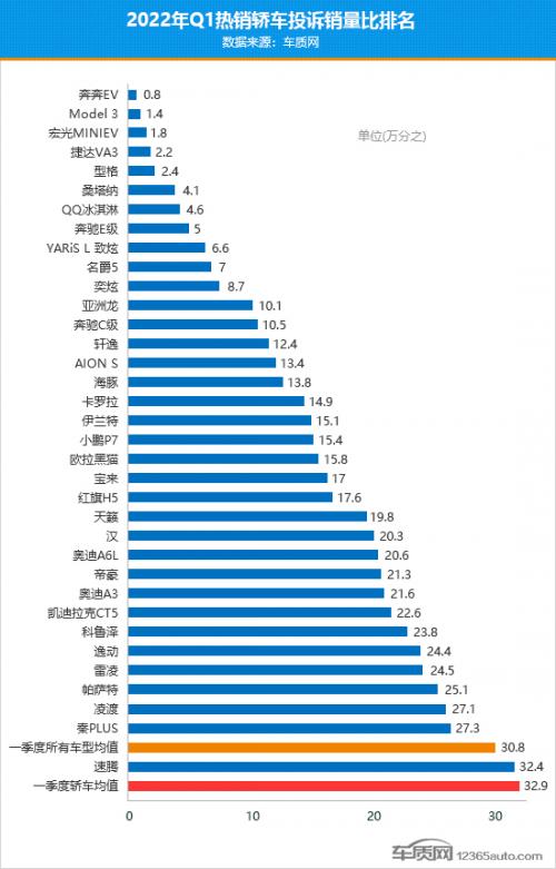 据国内领先的缺陷汽车产品信息收集平台车质网数据显示,2022年一季度共受理国内轿车投诉量累计为13,241宗,乘联会数据显示同期国内轿车(除进口车)销量约为259万辆。除进口车型外,一季度有销量数据支撑的轿车共有207款,为确保数据的准确性,车质网本次只统计这207款车型的首次投诉案例,计算得出2022年一季度轿车投诉销量比均值为万分之32.9,数值较2021年四季度的万分之37.7明显下降,整体投诉销量比表现呈现持续向好态势。