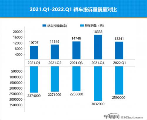从近一年来各季度轿车投诉量销量变化来看,一季度轿车(除进口车)投诉量出现明显回落,较2021年四季度下降27.8%,结束了此前的“三连涨”。但与去年同期相比,一季度的投诉量仍保持着正增长,较2021年一季度上涨23.7%。与投诉量走势相同,一季度轿车的销量呈现出冲高回落的态势,较2021年四季度下降14.6%。但整体来看,一季度的销量依旧明显高于2021年前三季度。