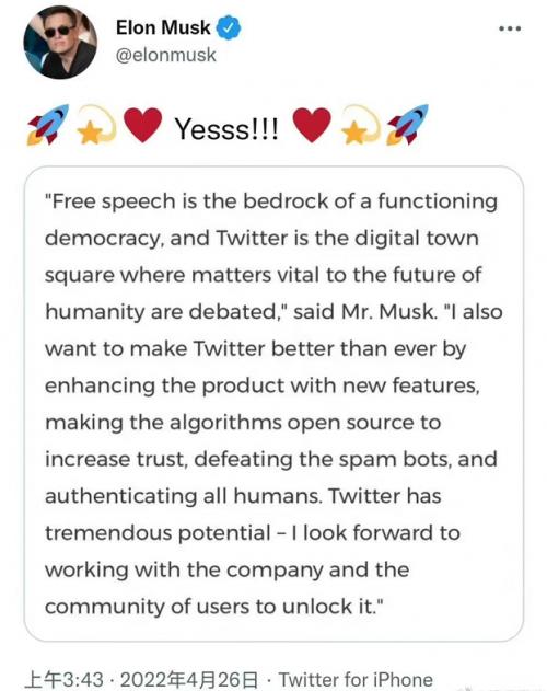 马斯克也表示,推特是一个数字化的城市广场,人们在此处讨论对人类未来至关重要的问题,自己希望过一系列新功能增强这个产品,比如开源算法增加公众的信任、进行人机验证解决垃圾邮件机器人等问题。