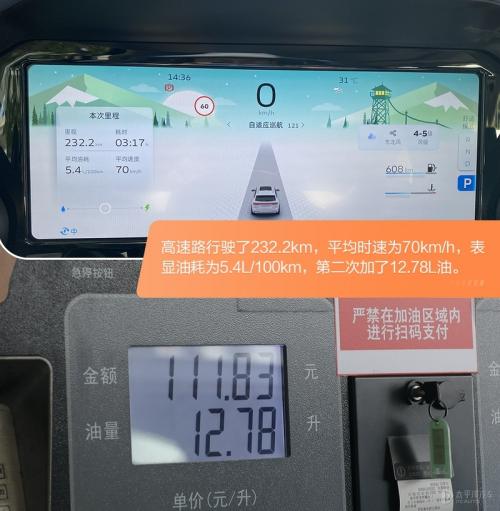 混动车在拥堵的低速状态下能发挥出自身低油耗的优势,但是它们在高速的燃油经济性很多时候是不如低速的城市路况。测试前的准备和车辆条件和测城市路况一致。高速道路行驶了232.2km,平均时速为70lm/h,这时候表显油耗为5.4L/100km。第二次加油量为12.69L,折算出百公里油耗成绩为5.49L/100km。星越L雷神混动在高速上的油耗数值相比城市路况没有明显的提升,反而还低了,说明了吉利雷神混动这套动力在高速油耗表现相比于“双田”有更高的燃油效率。