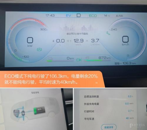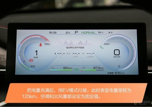 首先进行的纯电续航测试,先把试驾车的电量充满,这是表显纯电续航里程为120km,然后长按EV按钮进入纯电模式,接着以ECO模式进行测试。